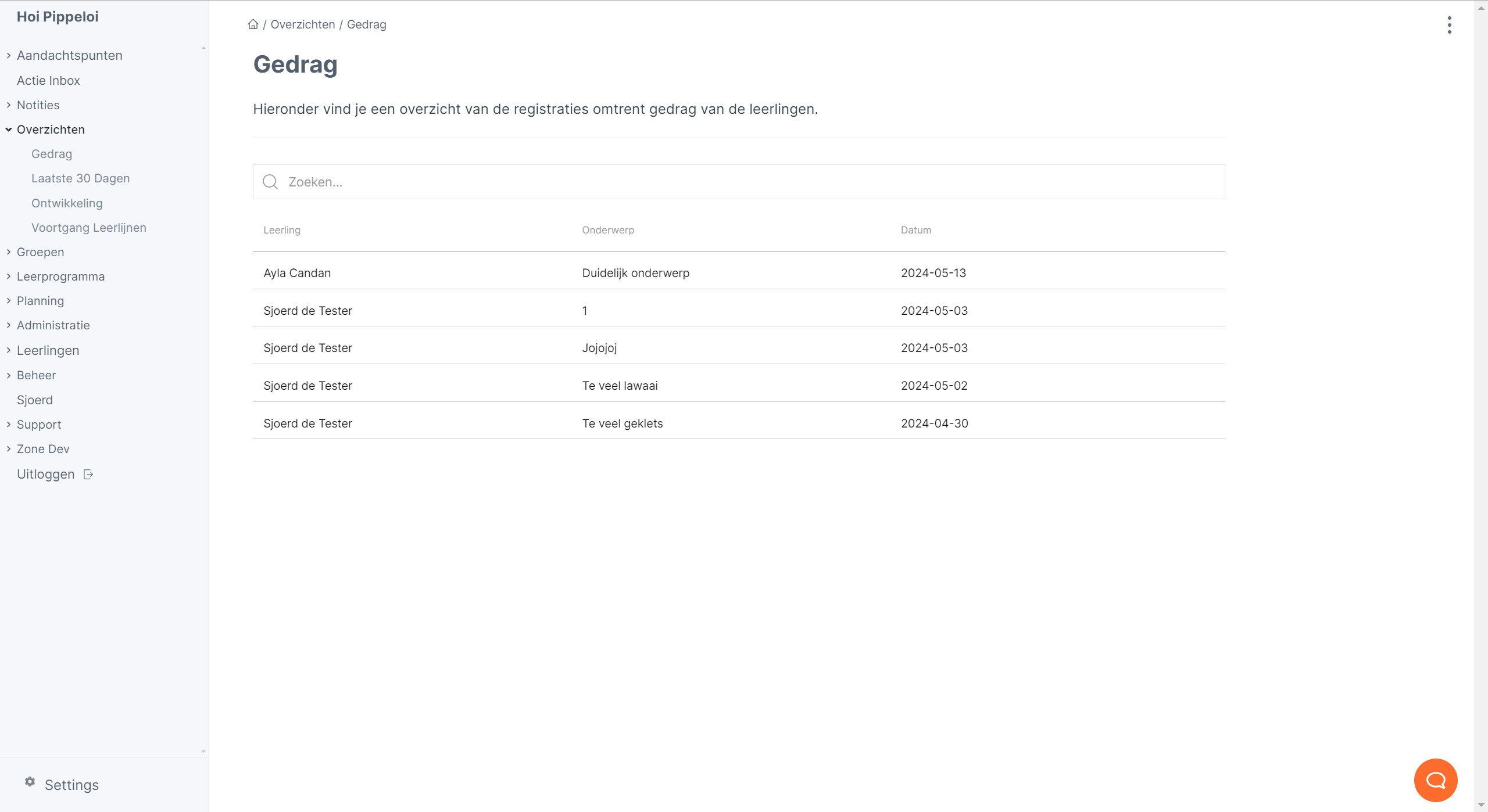 Onder Overzichten > Gedrag kun je de gedragsincidenten terug vinden in een tabel.